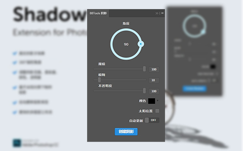 BBTools Shadow是一款photoshop投影插件,轻松制作出各种物体的倒影,不管是文字、图层还是智能图层都可以直接添加倒影,非常真实。阴影太假?使用BBTools Shadow插件,一键生成360°全角度逼真的阴影效果,支持文本、栅格化图层、形状图层和智能对象图层,可自定义阴影参数,包括阴影的角度、大小、颜色、模糊和不透明度。让你正式告别阴影太假的困扰。